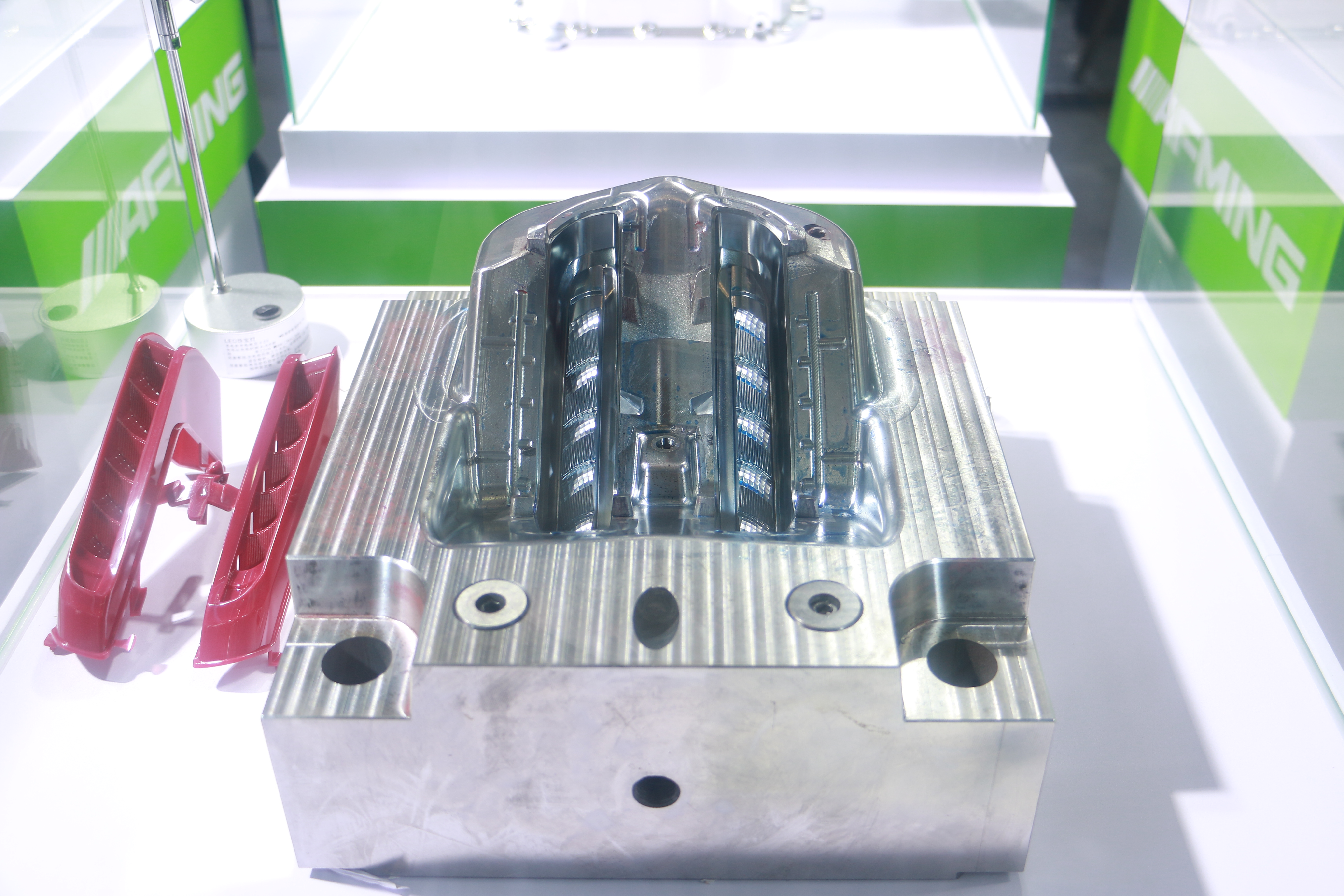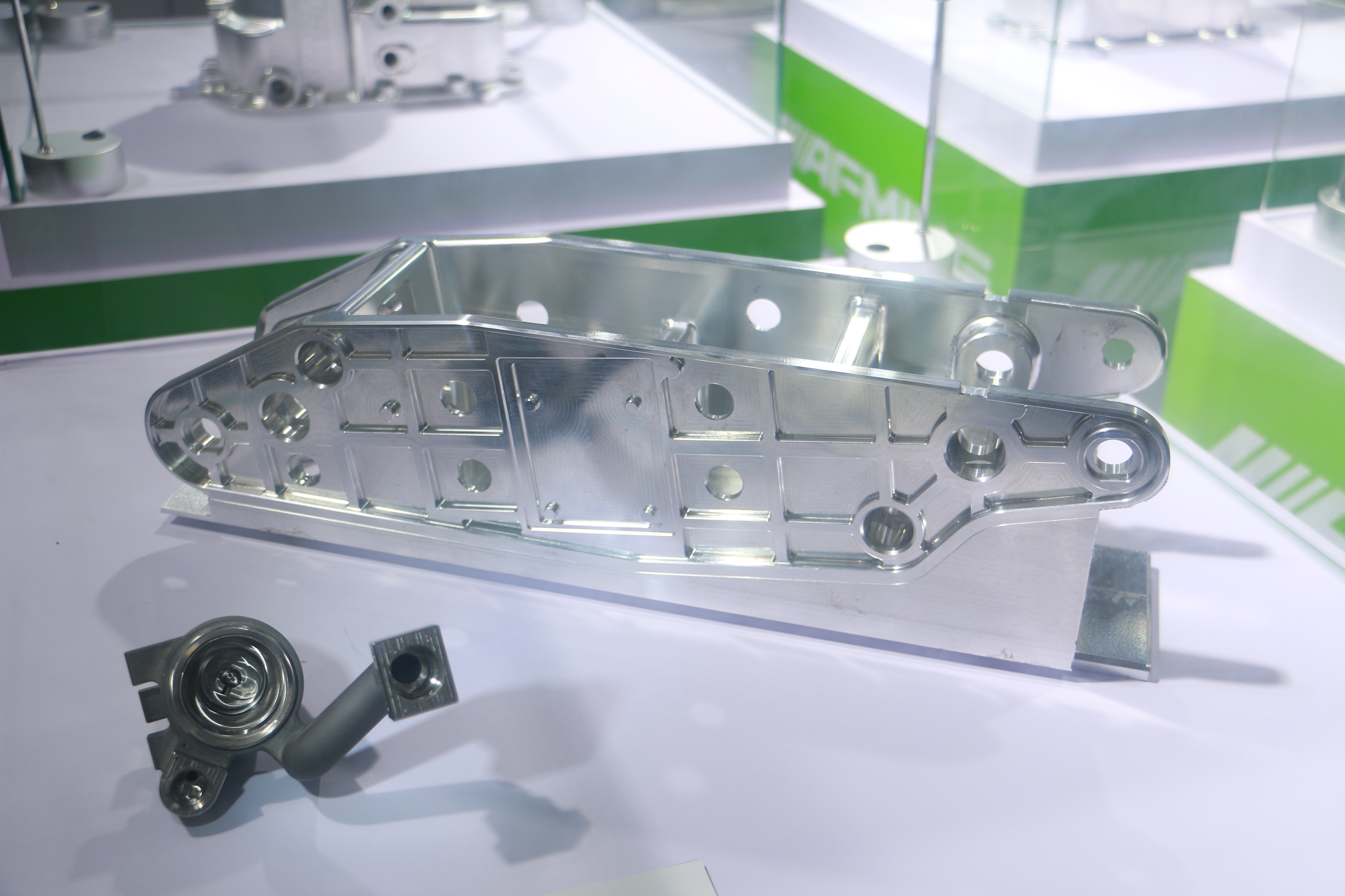 展位展示臺整齊陳列著 GMU400、600五軸聯動加工中心加工的成品 ——機器人大腿結構件、汽車變速箱殼體,開式葉輪等,不少觀眾湊近觀察表面光潔度,還不時向工作人員詢問加工參數。